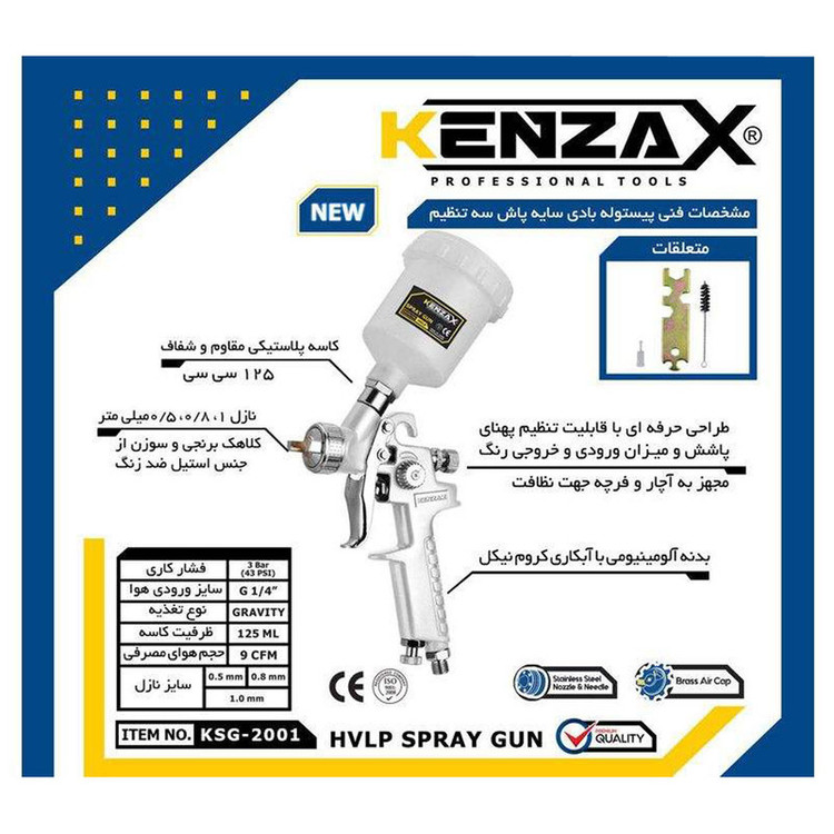 سوزن از جنس استیل دارای بدنه فلزی مستحکم و ارگونومیک بدنه با آبکاری نیکل و روکش پلاستیکی دسته تکنولوژی HVLP
