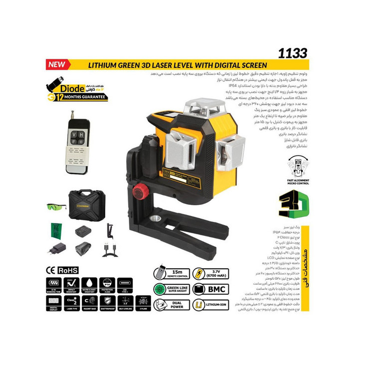 ویژگیهای تراز لیزری : باتری , دارای سیستم تراز خودکار , قابلیت نصب روی پایه , قابلیت نمایش خط , نمایش خط لیزر افقی , نمایش خط لیزر عمودی