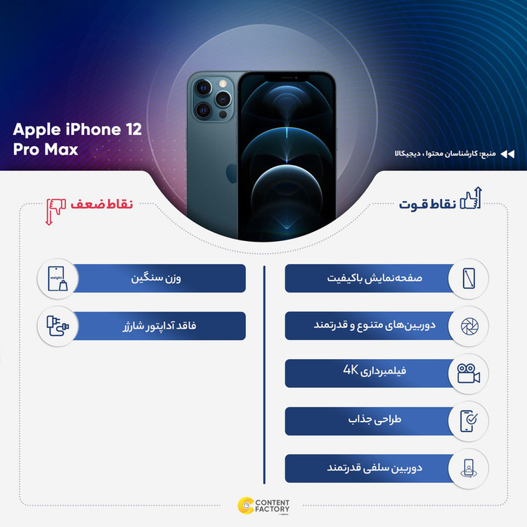 گوشی موبایل iPhone 12 Pro Max LLA پرچمدار جدید شرکت اپل است. اپل برای ویژگیها و طراحی کلی این گوشی از همان فرمول چند سال اخیرش استفاده کرده است. نمایشگر آیفون 12 Pro MAX به پنل Super Retina مجهز شده است تا تصاویر بسیار مطلوبی را به کاربر عرضه کند. این نمایشگر رزولوشن بسیار بالایی دارد؛ بهطوریکه در اندازه 6.7 اینچیاش، حدود 458 پیکسل را در هر اینچ جا داده است. قاب پشتی آیفون جدید هم از شیشه ساخته شده تا هم گوشی مشکل آنتندهی نداشته باشد و هم امکان شارژ بیسیم باتری در این گوشی وجود داشته باشد. آیفون جدید میتواند به مدت 30 دقیقه در عمق 4 متری آب دوام بیاورد. تشخیص چهره با استفاده از دوربین جلو دیگر ویژگی است که در آیفون جدید اپل به کار گرفته شده است. اما جالبترین و واضحترین تفاوت در این محصول جدید، دوربینهایی است که این بار به شکل چهارگانه در قاب پشتی جا خوش کردهاند. سه دوربین با سنسورهای 12مگاپیکسلی بههمراه دوربین چهارم از نوع عمیق TOF 3D LiDAR scanner عکسهایی با کیفیتِ بسیار بالا و کاملاً رضایتبخش را به کاربر هدیه میدهد. قابلیت اتصال به شبکههای 4G و 5G، بلوتوث نسخه 5، نسخهی 14 از iOS دیگر ویژگیهای این گوشی هستند. ازنظر سختافزاری هم این گوشی از تراشهی جدید A14 بهره میبرد که تا بتواند علاوه بر کارهای معمول، از قابلیتهای جدید واقعیت مجازی که اپل این روزها روی آن تمرکز خاصی دارد، پشتیبانی کند. به گفته خود شرکت اپل این گوشی دارای سرعتی 80 برابر نسخه 11 خود است. پارت نامبر این گوشی iPhone 12 Pro Max LLA است که متعلق به کشور چین است. گوشیهای نات اکتیو با قرار گرفتن سیمکارتهای داخلی اکتیو میشوند و برخلاف مدل اکتیو پلمپ کالا باز نشده است. گوشیهای اکتیو برند اپل هم به این شکل هستند که به دلیل محدودیتهای برخی از محصولات اپل برای کشور ایران، در کشورهای همسایه بهصورت رسمی با یک بار قرار گرفتن سیمکارت، اکتیو شده و پلمپ میشوند و باید بدانید که این پروسه هیچ مشکلی در راستای گارانتی کالا بههمراه ندارد. پارتنامبرهای اروپا و ژاپن و امارات تک سیمکارت هستند و پارتنامبرهای مربوط به امارات هم از فیس تایم پشتیبانی نمیکنند. پارتنامبر JA (ژاپن) هم حتی در حالت سایلنت صدای شاتر عکس قطع نمیشود.