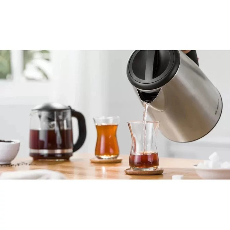 از ویژگیهای بسیار مهم کتری و قوریهای برقی توان مصرفی دستگاه است. زمانی که توان مصرفی دستگاه زیاد باشد، دستگاه با سرعت بیشتری به عمل میآید و شما میتوانید فوری به یک فنچان چای داغ دست پیدا کنید. چای ساز بوش مدل TTA5603 دارای حداکثر توان مصرفی 1800 وات است. یعنی در یک چشم برهم زدن آب شما جوش میآید. این مدل به صورت کتری و قوری روی هم ساخته شده است. نحوه گرم شدن آن به واسطه یک هیتر برقی کوچک انجام میشود که کتری روی آن قرار میگیرد و گرما را دریافت میکند. سپس باید قوری را روی کتری سوار کرد تا چای دم بیاید. از ویژگیهای این مدل آن است که شما قابلیت 360درجه چرخش را در این مدل دارید و میتوانید در هر کجای آشپزخانه این چای ساز برقی را قرار دهید. کتری استیل دستگاه دارای ظرفیت 1.7 لیتر و قوری دستگاه نیز که شیشهای بوده دارای یک لیتر ظرفیت است. همچنین قوری شیشهای این مدل، تفاله گیر دارد که در این حالت دیگر نیازی به صافی نخواهید داشت و ظرفیت آن 0.7 لیتر است.