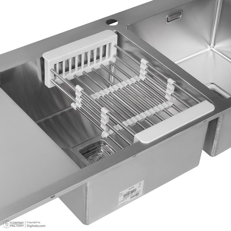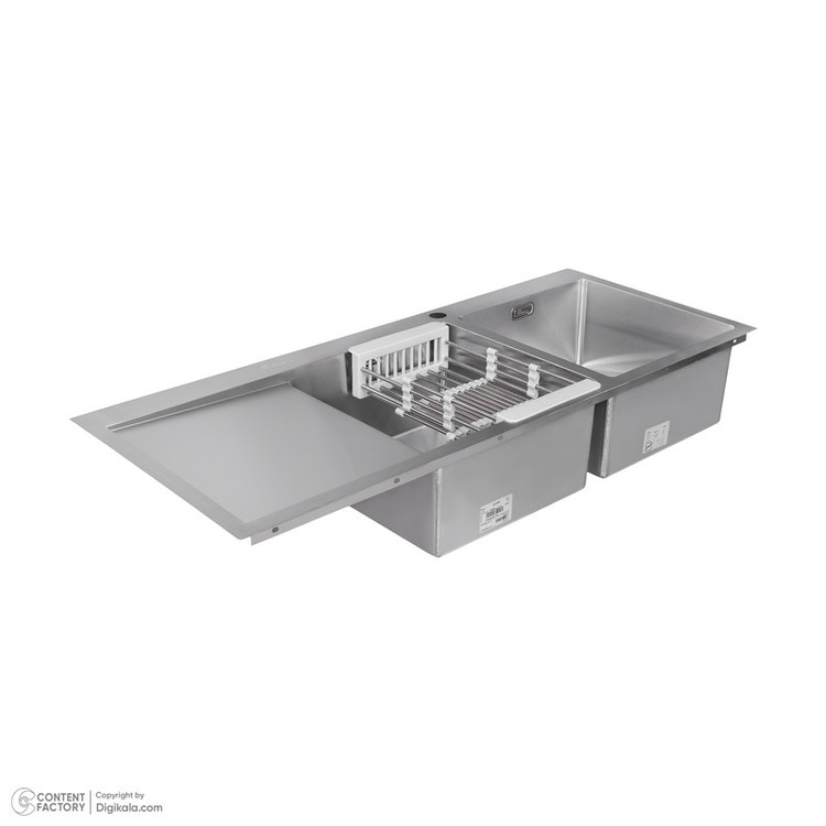 ابعاد: 120×50×22 / ضخامت ورق: 1 میلیمتر / ظرفیت لگنها: هر لگن 33 لیتر / محل نصب شیر آب: روی سینی / نوع سیفون : دو کف شور، دو سر ریز