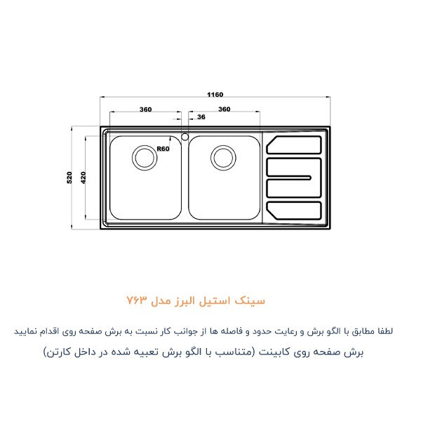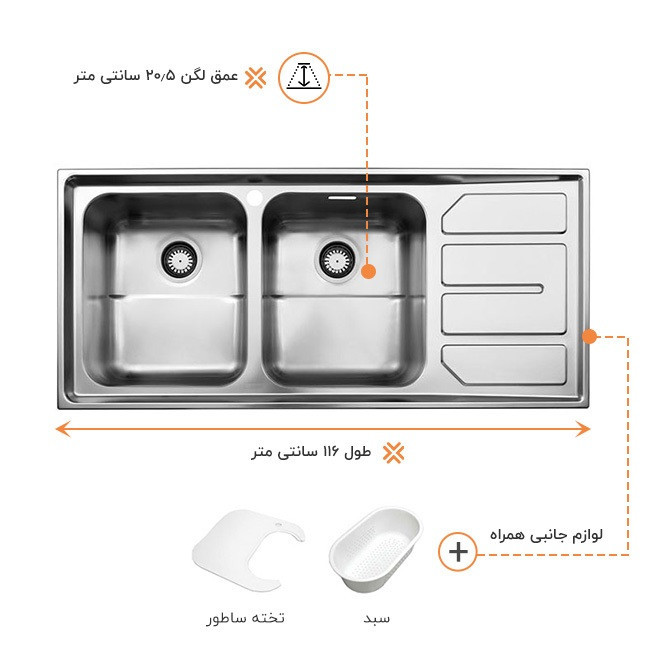 ظرفیت لگن : 56 لیتر/ ضخامت ورق سینک : 0/8 میلیمتر