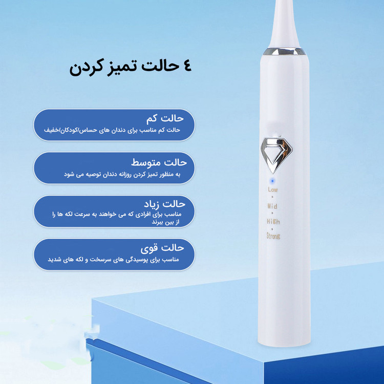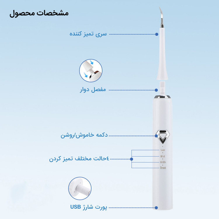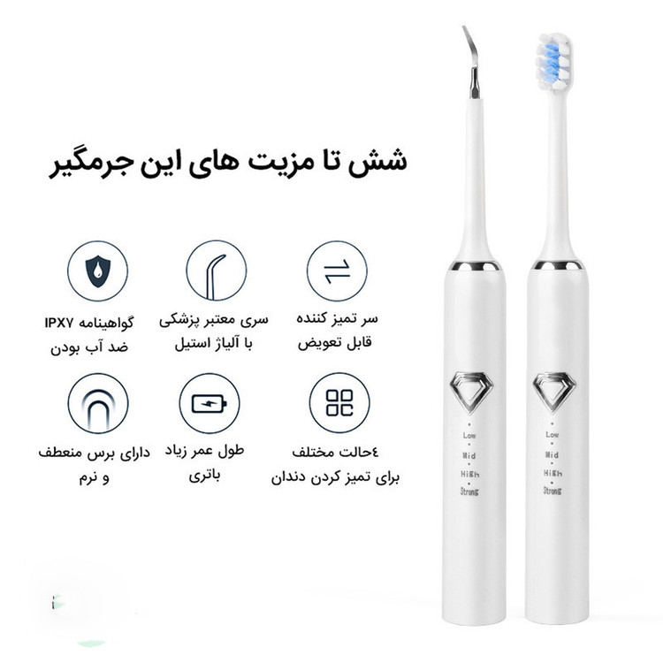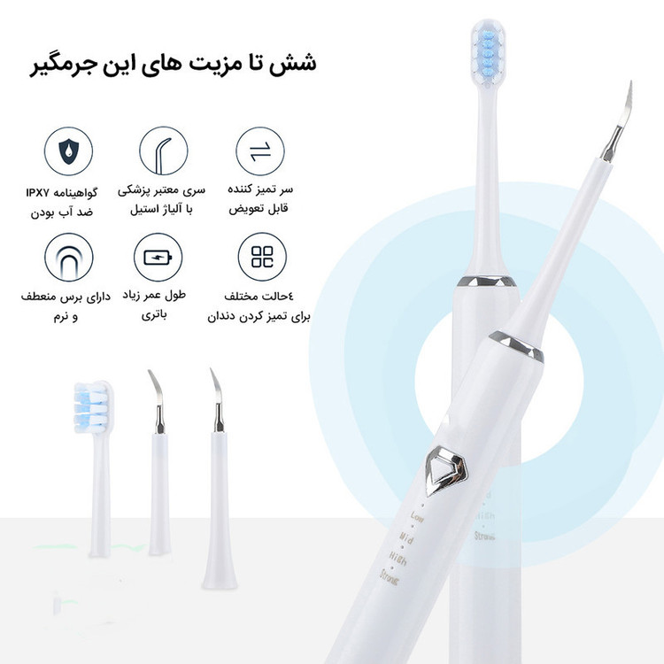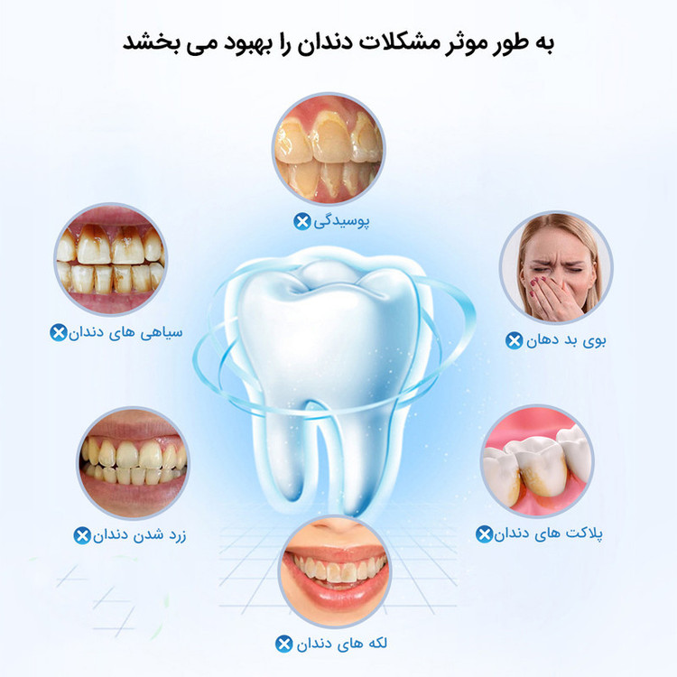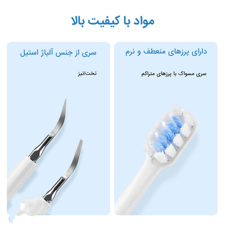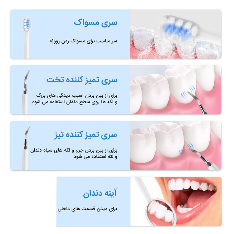 اقلام همراه: 5 عدد سری مسواک یک عدد سری جرم گیر تخت یک سری جرم گیر تیز یک عدد آینه دندان یک عدد کابل شارژ دفترچه راهنمای کاربر