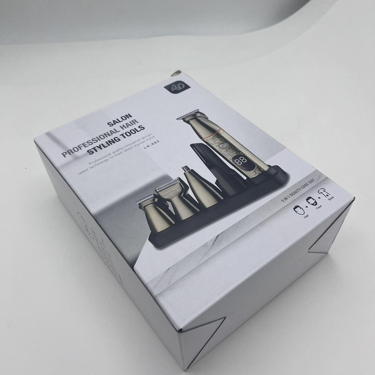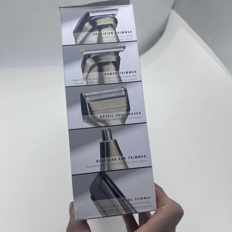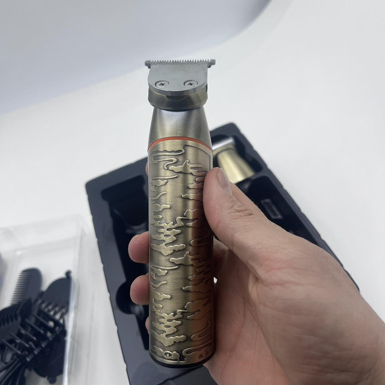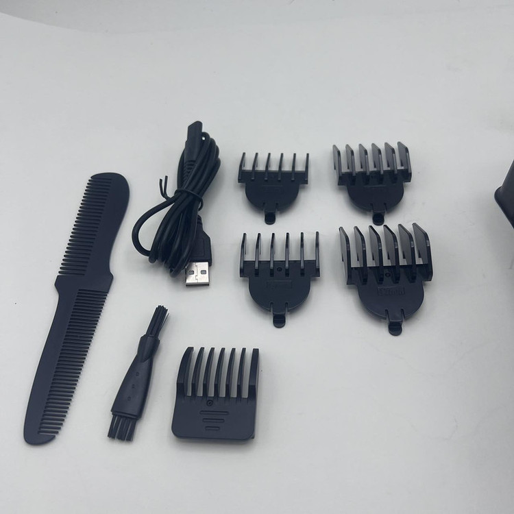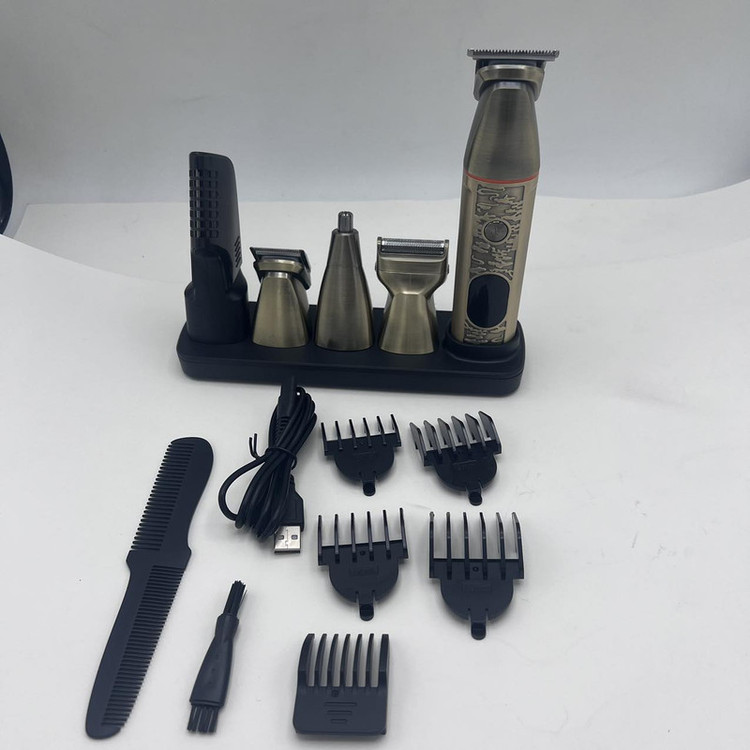 اقلام همراه: دستگاه ماشین اصلاح با بدنه فلزی 6 عدد شانه کابل شارژ 5 عدد سری مخصوص کار های مختلف برس تمیز کننده شانه سر و استند شارژ