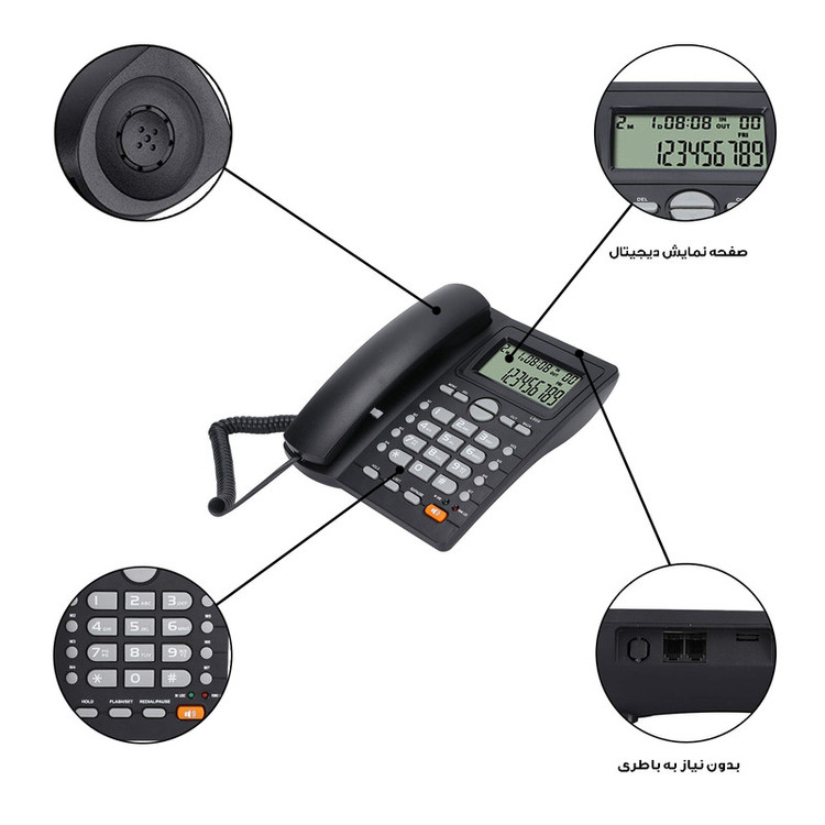 امکانات و قابلیتها: دارای قابلیت Caller ID ، دارای دکمه Hold ، دارای دکمه Speakerphone ، دارای دکمه Redial ، قابلیت اتصال به دیوار