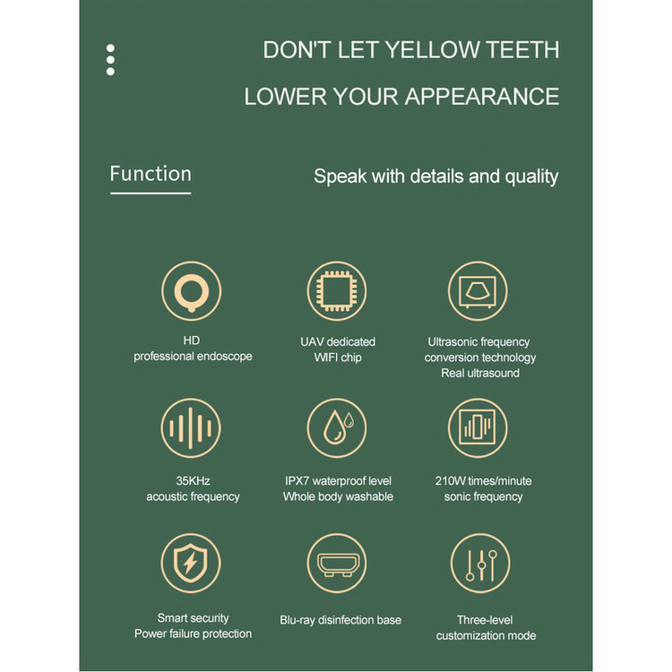 1 x جرم گیر دندان برقی 1x پایه شارژ وایرلس و محفظه ضد عفونی کننده اشعه UV 4 x سر تمیز کننده 1x آچار نصب 1xکابل DC 1 x راهنمای کاربر راه اندازی دستگاه و دوربین